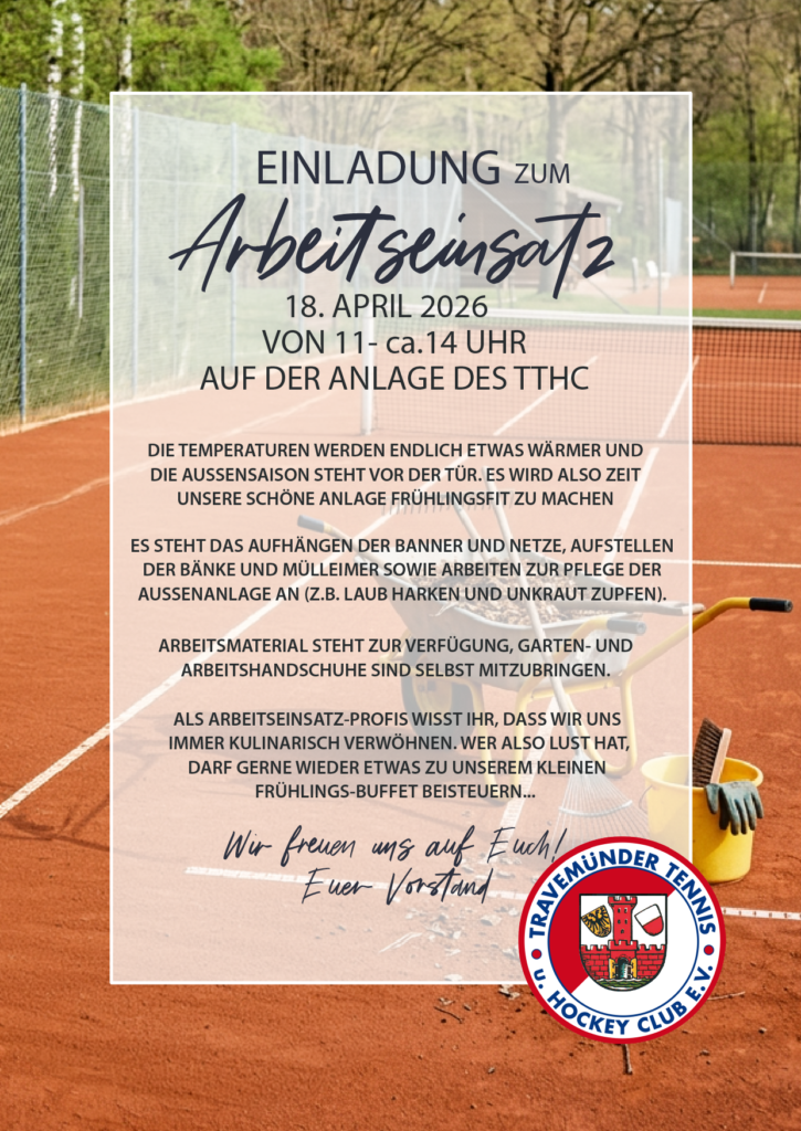„…Volljährige Mitglieder der Tennisabteilung sind verpflichtet, sechs Stunden im Jahr für den Verein in einem Arbeitseinsatz oder in einer Arbeitsgruppe zu arbeiten, anderenfalls ist zum Jahresende ein Betrag in Höhe von 80,00 € zu zahlen.“